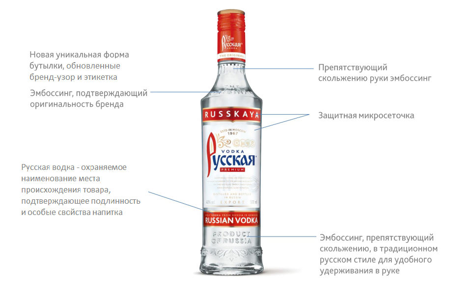 Препятствующий скольжению руки эмбоссинг в традиционном русском стиле и специальная защитная микросеточка на этикетке, помимо премиальности, обеспечат дополнительную защиту от подделок.
