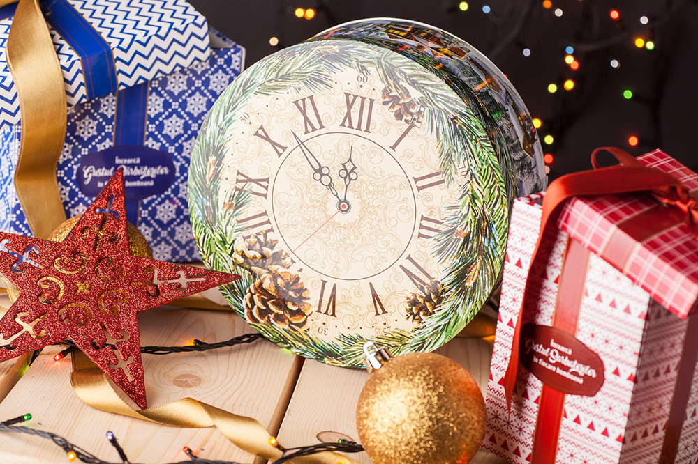 Серия конфет Gustul Sarbatorilor состоит из трёх позиций, и для каждой из них создан свой дизайн, во многом напоминающий праздничную подарочную коробку. Используя яркие цвета и характерные новогодние паттерны, дизайн сразу идентифицируется потребителем как праздничный, а дополнительные детали в виде перевязанных на крышке коробки лент усиливают образ подарочной упаковки. Отдельно стоит отметить круглую коробку, на которой расположены стилизованные зимние иллюстрации и изображение циферблата, что в совокупности создаёт недвусмысленный новогодний образ.