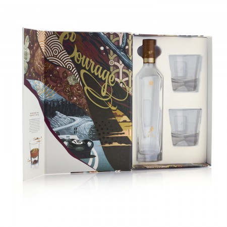 Коробки изготовлены из высококачественного жёсткого картона, поверх которого нанесена перламутровая бумага с тонкой блестящей отделкой. Жесткая передняя крышка коробки открывается, демонстрируя бутылку виски и два стакана в углублениях на перламутровом фоне.