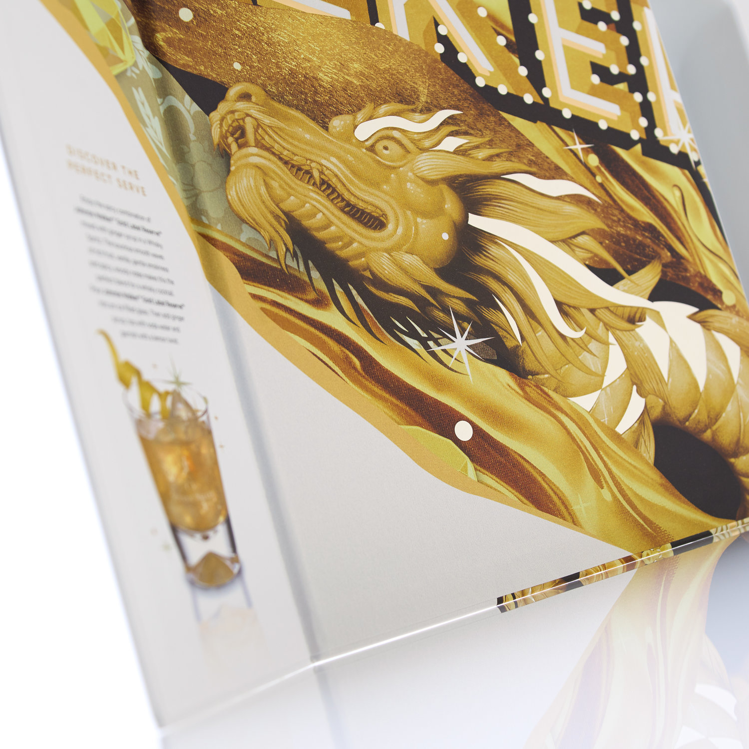 Чтобы усилить звучание темы, команда компании MW использовала отделку деталей золотой фольгой в основных зонах упаковки, и предоставила дегустационные заметки в текстовом блоке на внутренней панели. Выньте бутылку и стаканы из их гнёзд, возьмите измельченный лед и кусочек апельсина, и пусть начнётся праздник!
