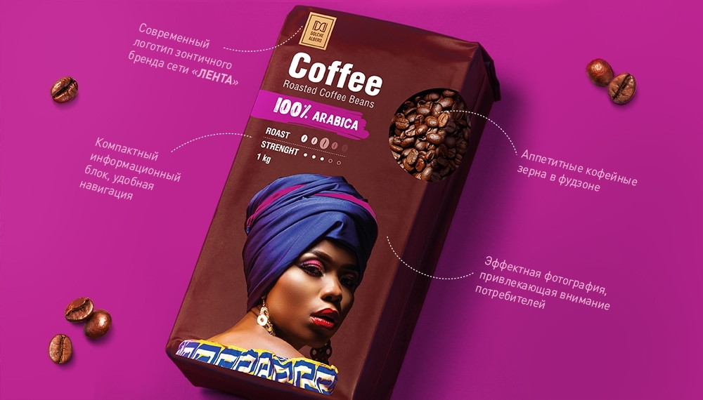Первые позиции в новой ассортиментной матрице – зерновой и молотый кофе. Задача выделиться на фоне консервативных конкурентов решена с помощью использования ярких акцентов в дизайне. Главным элементом, привлекающим внимание, стала эффектная фотография женщины и ее взгляд, направленный на потребителя. Информационный блок расположен компактно в одном месте, что делает навигацию понятнее и ускоряет процесс выбора продукта покупателем. Аппетитные идеальные кофейные зёрна в фудзоне вызывают доверие и указывают на качество продукта.