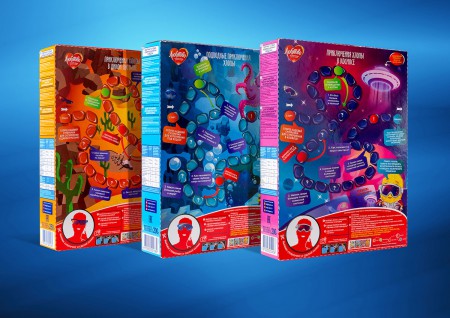 Первая часть нового позиционирования включает в себя три позиции: «Овсяные колечки с мёдом», «Шарики шоколадные» и «Медовые шарики и звёздочки». Главной задачей при разработке дизайна была увлекательная интерактивная составляющая. Как результат, каждая картонная упаковка содержит очки для суперселфи, которые можно вырезать для развлечения и фотографий, и карту для коллекционной игры с фантазийными мирами «Подводные приключения Хлопы». Хлопа Любятова – персонаж, хорошо знакомый покупателям. Её обновленный образ делает качественную продукцию компании ещё заметнее среди схожих позиций на полках супермаркетов.