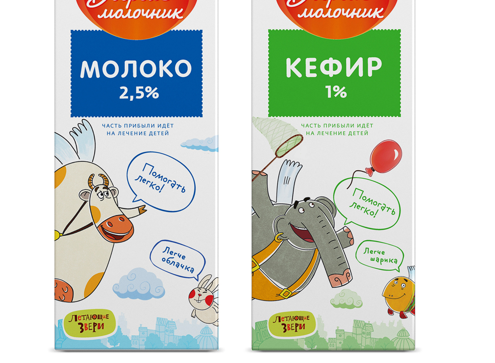 Детский мультсериал «Летающие звери», тоже основанный на благотворительности, позволил объединить и название бренда «Добрый молочник», и цели торговой марки. Звери сериала живут на Летающем острове, и все дела у них получаются легко, легче лёгкого. Точно так же как на Летающем острове, легко помочь и в реальной жизни – достаточно просто купить упаковку продукции «Добрый молочник», и часть средств от покупки поступит в фонд помощи детям.