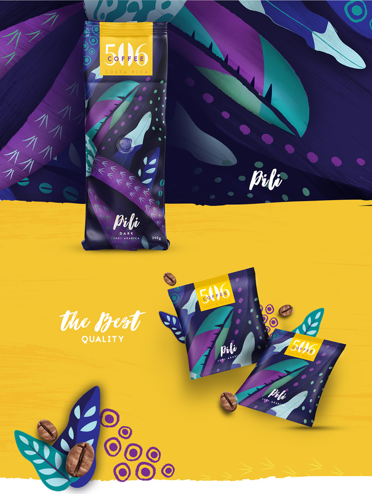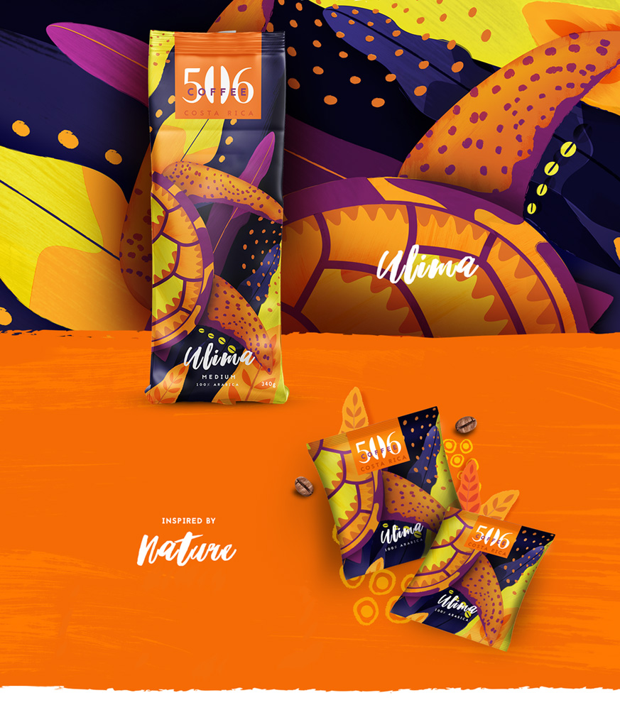 Графический дизайнер Daniela Jiménez (Коста-Рика) оформила местный кофейный бренд 506 coffee. В основе дизайна - местная племенная культура.