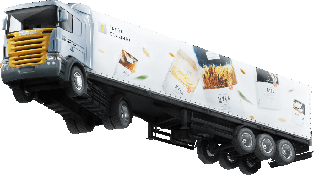 Компания «Грейн холдинг» продает муку и всевозможные хлебобулочные изделия собственного производства. В Студии Артемия Лебедева разработали дизайн грузовиков, превращающий перевозку хлебов, батонов, булочек, сдоб и ватрушек в эффектную самопрезентацию холдинга.
