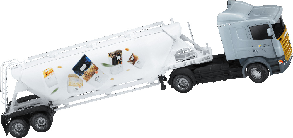 Для полуприцепов созданы композиции с летающей продукцией холдинга. Разлетаются зерна, парят пачки муки.