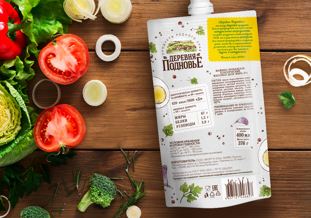 Местное происхождение продукта отражено в нейминге «Деревня Подновье» и саблайне «продукты родного края». В сочетании с логотипом в гравюрной технике бренд переносит нас ассоциативное поле уютной и тихой деревни, где разгуливают на просторе куры, а воздух наполнен ароматом цветов. Именно там и создается натуральный, по-домашнему вкусный майонез.