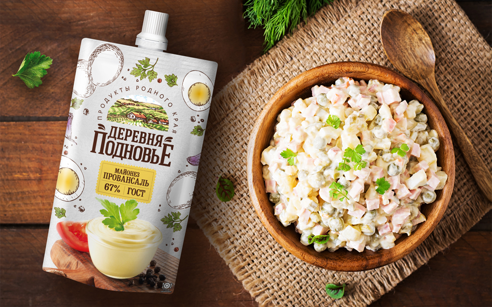 Подновье — это слобода в составе Нижегородской области, в которой находится местный производитель натуральных продуктов для нового СТМ. Поскольку майонез редко ассоциируется с местным деревенским продуктом, основной задачей стало подчеркнуть его натуральность и локальное происхождение.