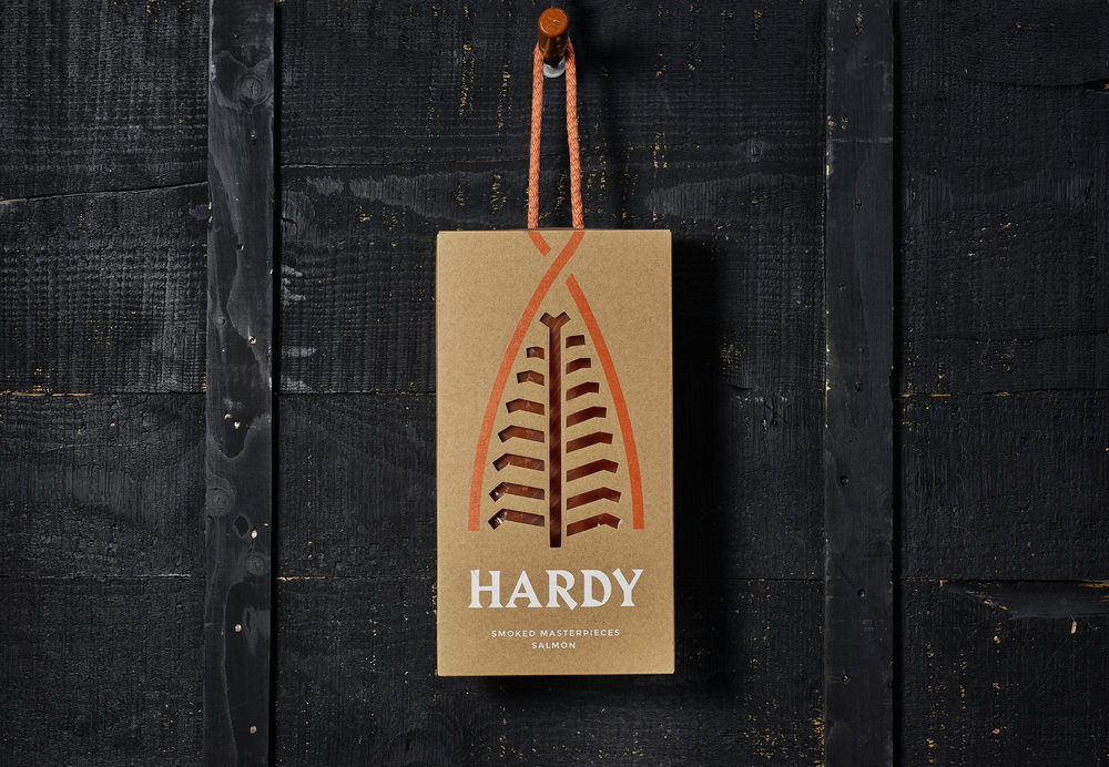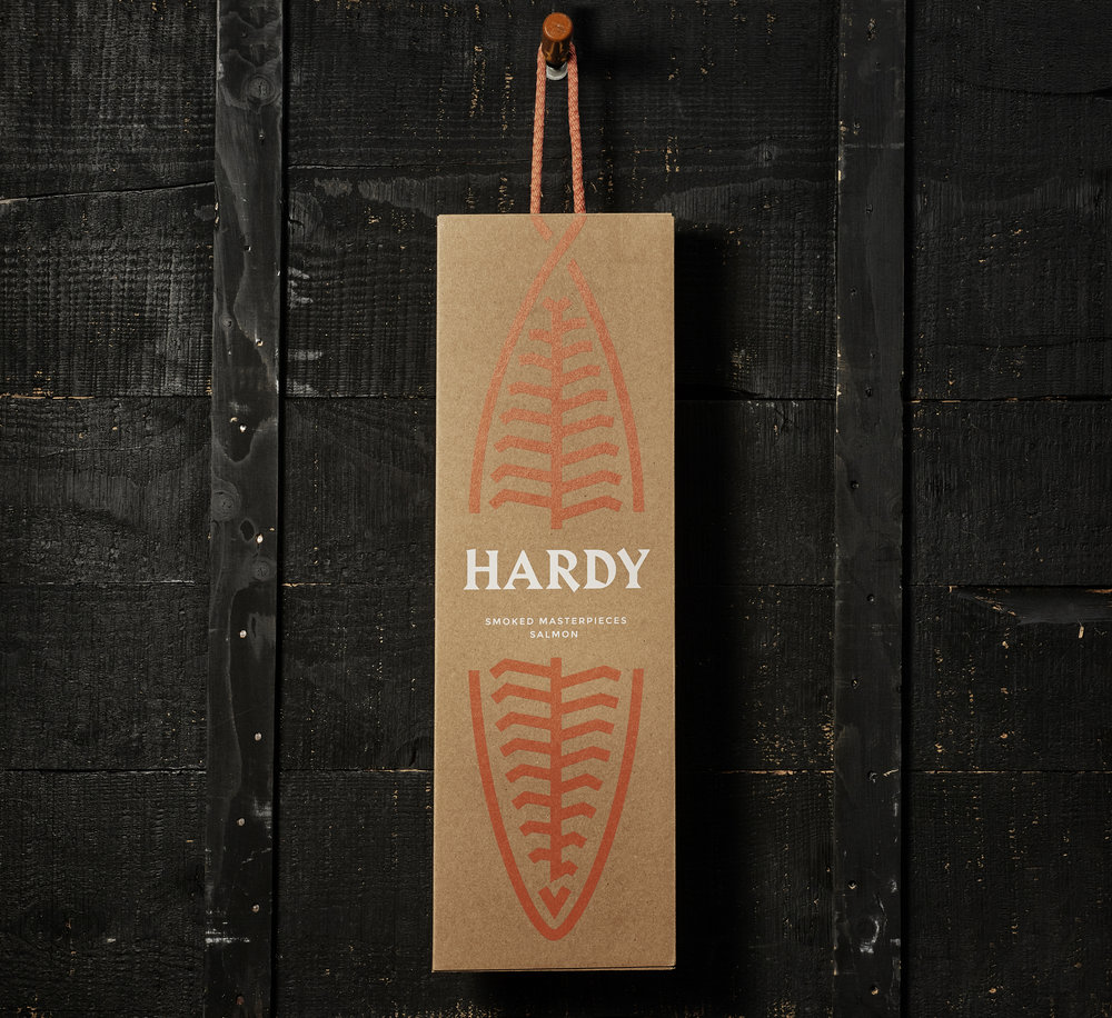 Айдентика бренда базируется на двух идеях: четкие, устойчивые шрифты, напоминающие немецкую эстетику, твердые и острые как нож, а также символ Hardy - графическое изображение филе лосося. Веревочная ручка является продолжением логотипа, изображенного на коробке. Аккуратная цветовая гамма ограничивается гармоничным сочетанием синего и оранжевого.