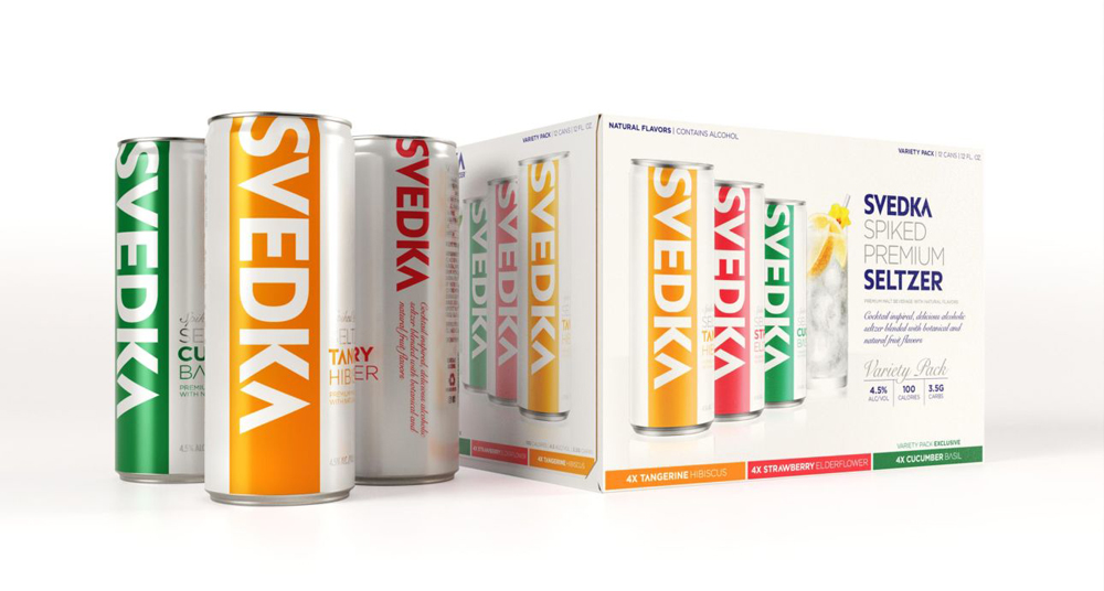 Бренд SVEDKA решил войти на быстро растущий рынок готовых к употреблению напитков и выпустил газированную слабоалкогольную версию. Дизайн упаковки был поручен команде американской студии Brigade. Они создали дизайн для алюминиевых банок и коробок для транспортировки.