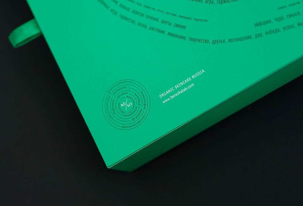 Подарочная коробка стала зеленой: выделяется на полке среди нейтральных конкурентов, и дополнительно подчеркивает натуральность состава. Типографическая иллюстрация, напоминающая спил березы, состоит из вдохновляющих слов о натуральности, природе и земле.