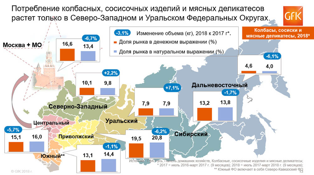 Исследование проводилось по данным потребительской панели GfK в городской и сельской России; были изучены покупки 10 тыс. домохозяйств за период с июля 2017 по март 2018 года по сравнению с аналогичным периодом годом ранее. Сегменты: колбасные и сосисочные изделия, мясные деликатесы, в том числе вареная колбаса, сосиски, варено-копченая колбаса, сырокопченая/сыровяленая колбаса, полукопченая колбаса, сардельки/шпикачки, ветчина, грудинка, шпик/сало, бекон, карбонад, шейка, ливерная колбаса и другие.