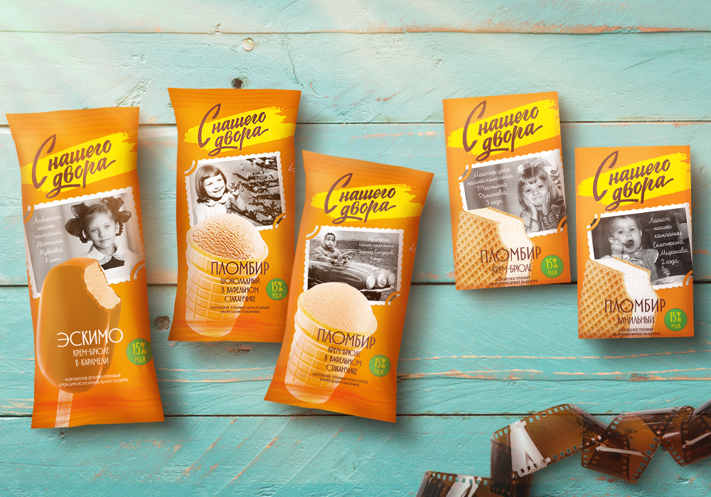Детские фотографии и цитаты сотрудников — от генерального директора, главного технолога, логистов до менеджеров по продажам — разместились на упаковках мороженого. Возникла целая ватага малышей, объединенных названием «С нашего двора».