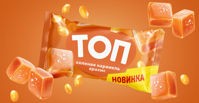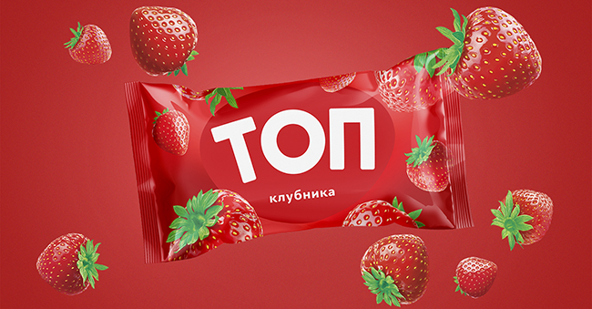 Упаковка обрела сочные цвета, соответствующие вкусу мороженого. Название и вкус продукта в белом цвете контрастируют с яркими фоновыми расцветками. Аппетитная фудзона добавила натуральность. Крупные рисунки главного компонента расположились по всей площади упаковки. За счёт вариации форм, размеров и углов поворота ингредиентов, создаётся впечатление полёта. Концепт подкрепляется слоганом «Настроение вверх», который игриво разместился над штрих-кодом. Всё это позволяет легко идентифицировать мороженое ТОП и дифференцироваться на фоне остальных производителей.