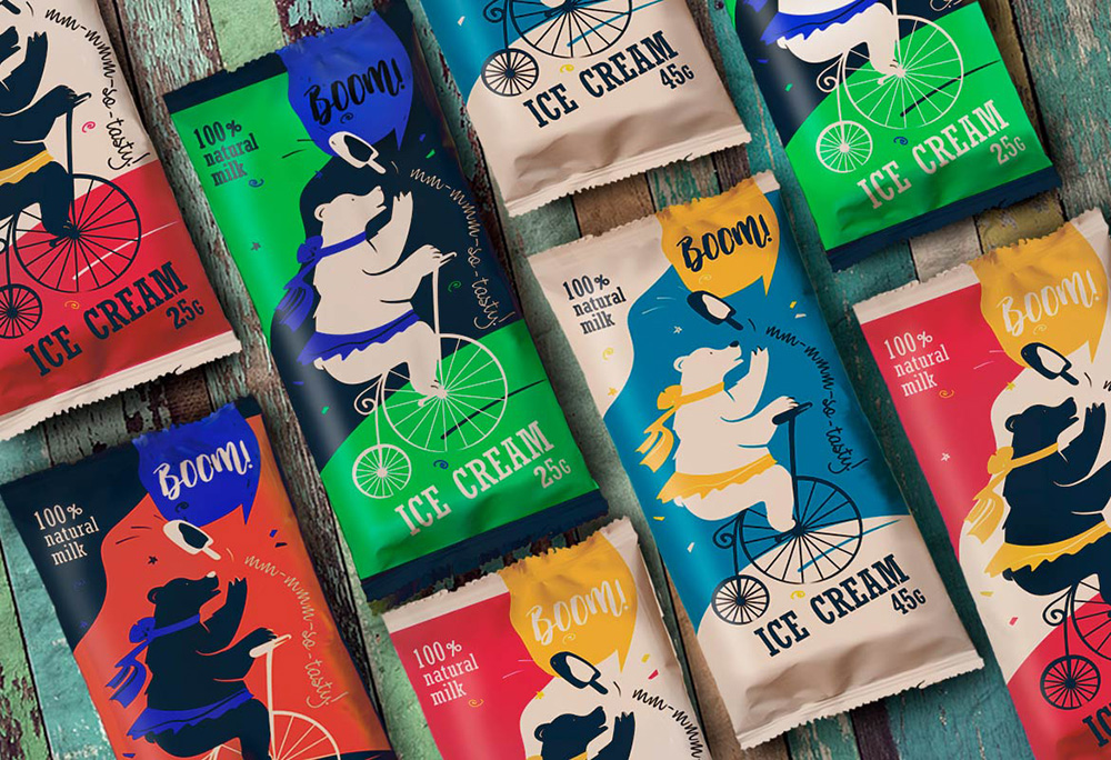 Дизайн-студия Ольги Зурашвили (Омск) разработала дизайн упаковки для мороженого Boom. В основу концепции легла идея цирка. Потому что цирк, как и мороженое, дает ощущение праздника, радости и возвращает людей в детство.