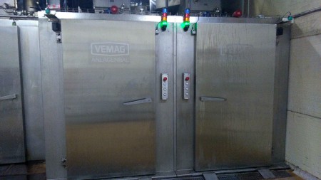 Новые комбинированные термоустановки фирмы Vemag позволяют избежать лишних трудозатрат. Оператор термообработки подгоняет рамы с сырой продукцией, которые автоматически уезжают внутрь тоннеля. После приготовления продукция перемещается дальше, где проходит охлаждение. Далее оператор выгоняет из установки готовый к упаковке продукт. Процесс автоматизирован: сотрудникам производства не требуется перегонять тележки с рамами из одной камеры в другую, их задача – проследить и проконтролировать процесс.