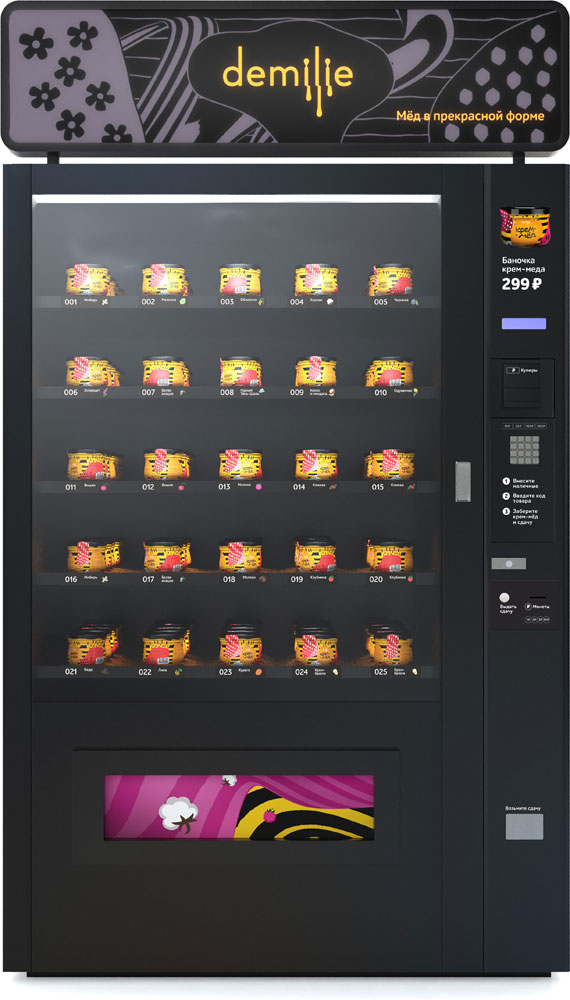 Крем-мед «Демилье» теперь продается в вендинговых автоматах. В Студии Артемия Лебедева оформили корпуса автоматов, а для всех деталей механизма сделали понятные подписи.
