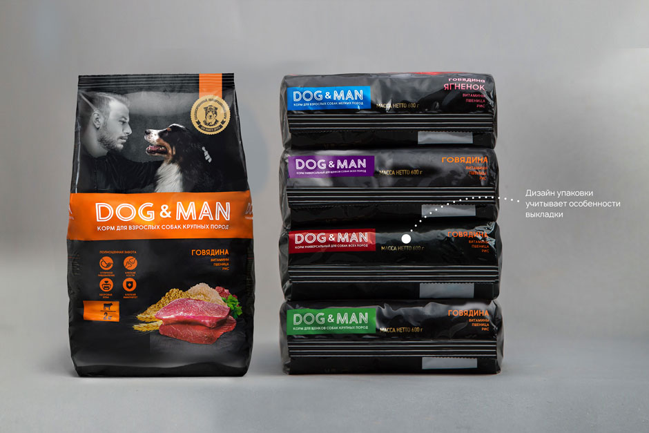 Сегодня на рынке питания для домашних животных немало сильных брендов. Перед заказчиком стояла задача вывести на полки новую торговую марку «DOG&MAN», сфокусированную на функциональных сухих кормах для собак, которая выделилась бы на их фоне.