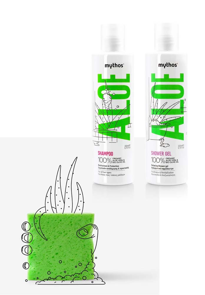Косметическая линейка Mythos / Aloe рассчитана на туристический рынок в Греции. Дизайн создавался в студии Luminous Design Group. По пожеланию производителя в упаковке использованы зеленый цвет и слово Aloe.