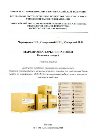 Российским государственным университетом им. А.Н. Косыгина (Технологии, Дизайн, Искусство) в сентябре 2018 г. издан конспект лекций – «МАРКИРОВКА ТАРЫ И УПАКОВКИ» (Учебное пособие). Авторы конспекта Н. В. Черноусова, И. Н. Смиренный и В. В. Кухарский.