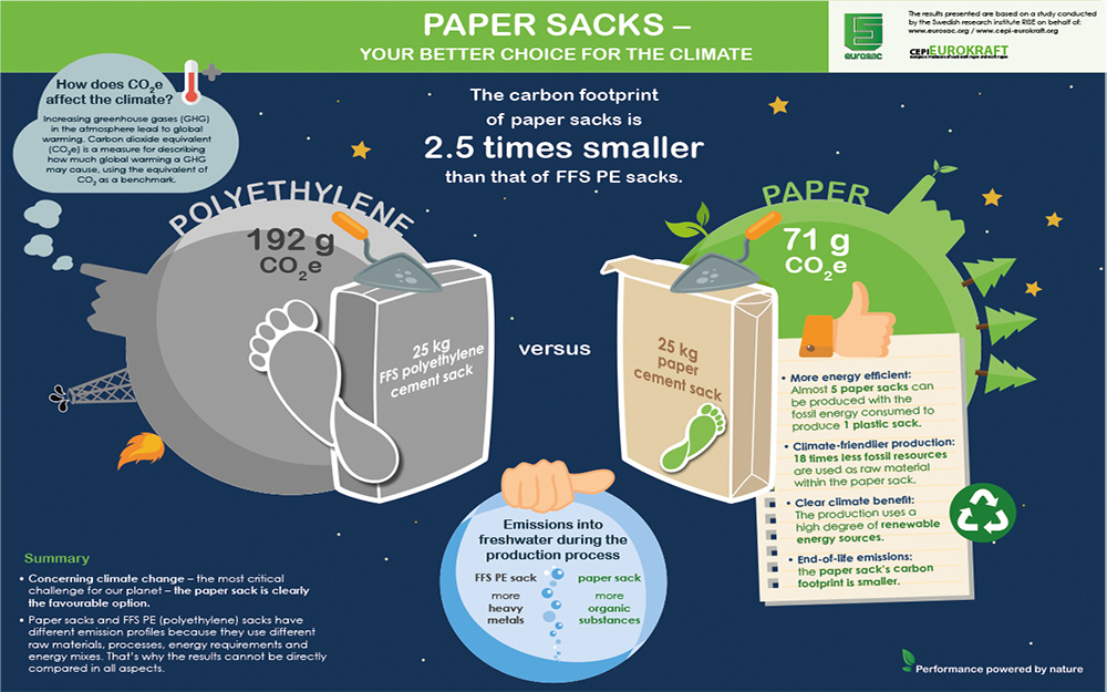 Новое сравнительное исследование шведской исследовательской организации Rise, проведённое по заказу группы European Paper Sack Research Group (ESG), представляющей сотрудничество стокгольмской CEPI Eurokraft и парижской Eurosac, показало, что количество условных выбросов CO2 для бумажных цементных мешков в 2,5 раза меньше, чем для полиэтиленовых цементных мешков, сформированных на упаковочных машинах FFS.