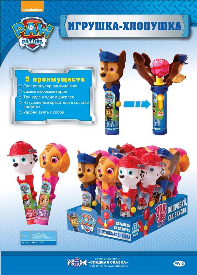 Компания «Сладкая сказка» выпустила новинку в линейке продуктов, выпускаемых под популярным брендом «Щенячий патруль» — игрушку-хлопушку с леденцом на палочке внутри.