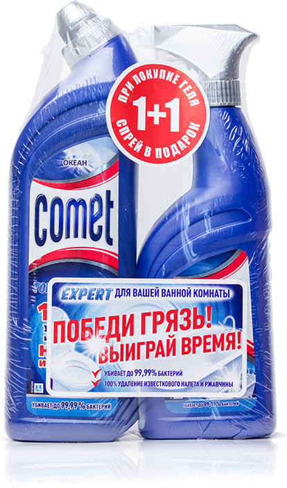 Нижний стикер разъясняет серийную принадлежность товаров. Так, например, Универсальный чистящий гель Comet Океан и Универсальный чистящий порошок Comet Лимон в банке относятся к серии universal и помечаются клеймом «универсальный» и красными крышками. Тогда как Числящий гель Comet Океан и Спрей для ванной Comet относятся к серии эксперт и брендируются серебристыми крышками. На первой паре изображены различные поверхности: кухонные и не только, на второй – поверхности для чистки, располагающиеся в ванной комнате. Обе пары чистящих средств станут отличными помощниками в борьбе с появляющейся грязью и вечно исчезающим временем.