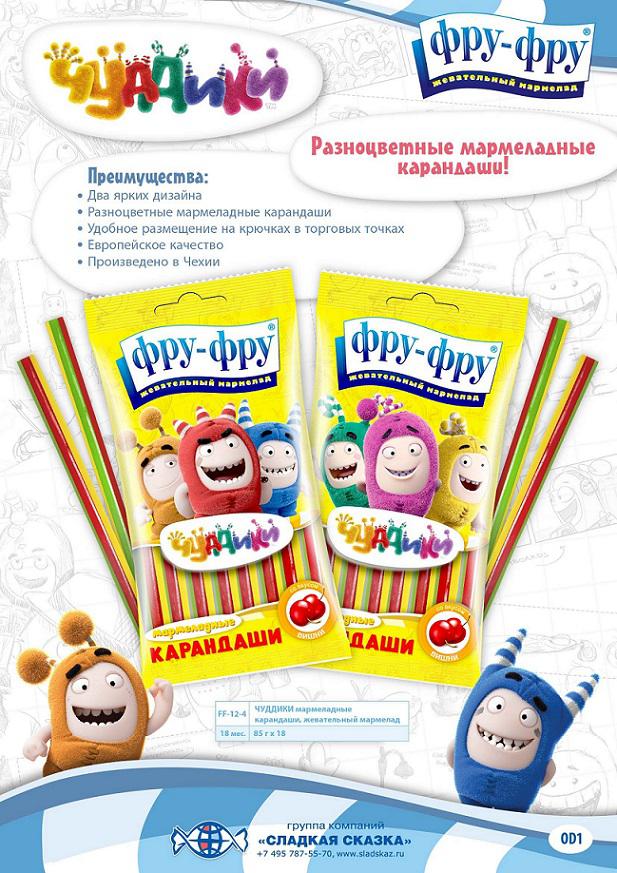 Первым продуктом в новой лицензии стал жевательный мармелад «Фру-Фру» «Мармеладные карандаши» «Чуддики» со вкусом вишни.