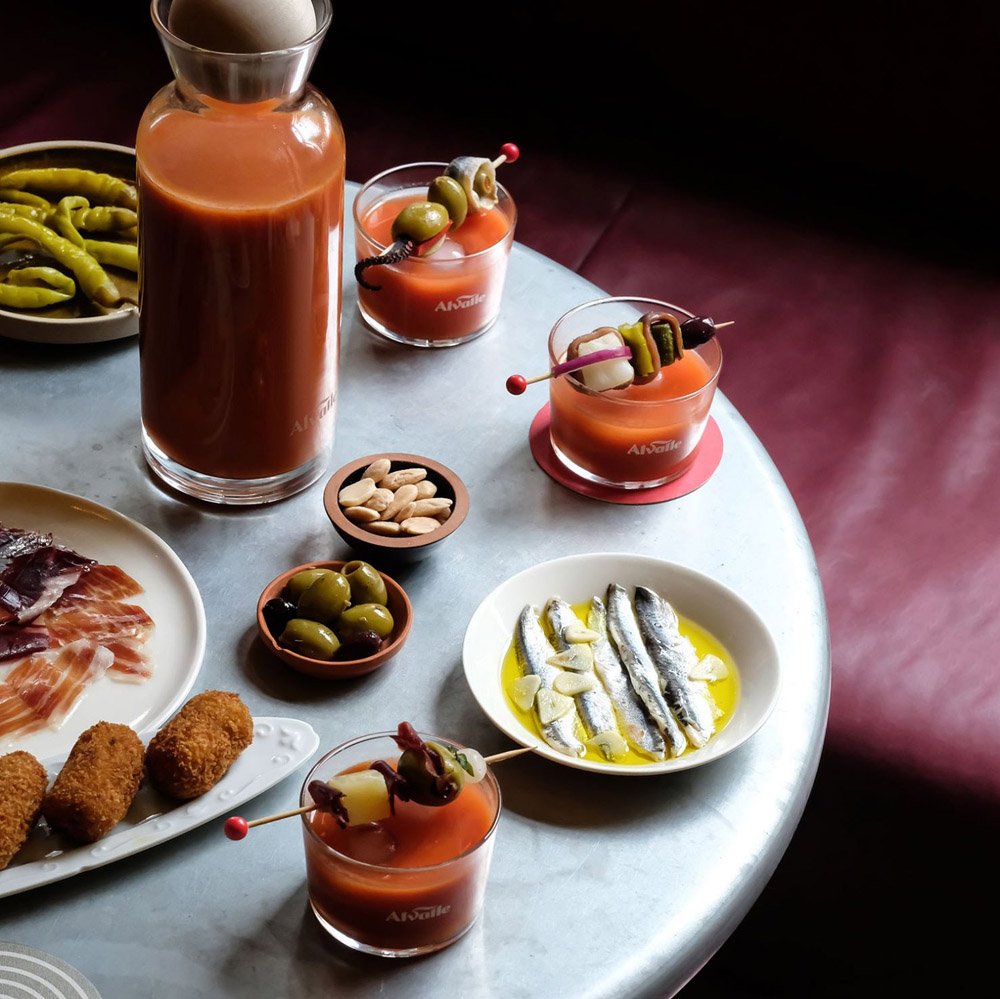 Работа дизайнеров – это новое прочтение испанской классики. В студии предложили новую форму упаковки и способ потребления гаспачо Alvalle. Новая бутылка выполнена в форме графина, закупоренного деревянным шаром. Гаспачо предлагается наливать не в суповые тарелки, а в стаканчики для аперитива и сервировать их классическими пинчос.