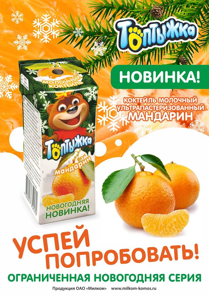 "Милком" представляет новогоднюю новинку - молочный коктейль "Топтыжка" со вкусом мандарина, сообщает пресс-служба "Комос Групп".
