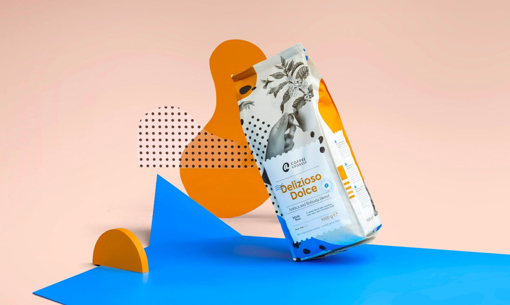 Такой смелый и эмоциональный коллаж с легкой отсылкой к стилю «мемфис» выглядит современно. Сочетание фотографий, ярких цветовых пятен и паттернов из зерен кофе бросаются в глаза и вызывают желание рассматривать, рассматривать и рассматривать. С задачей выделится на полке Not Perfect справились на отлично.