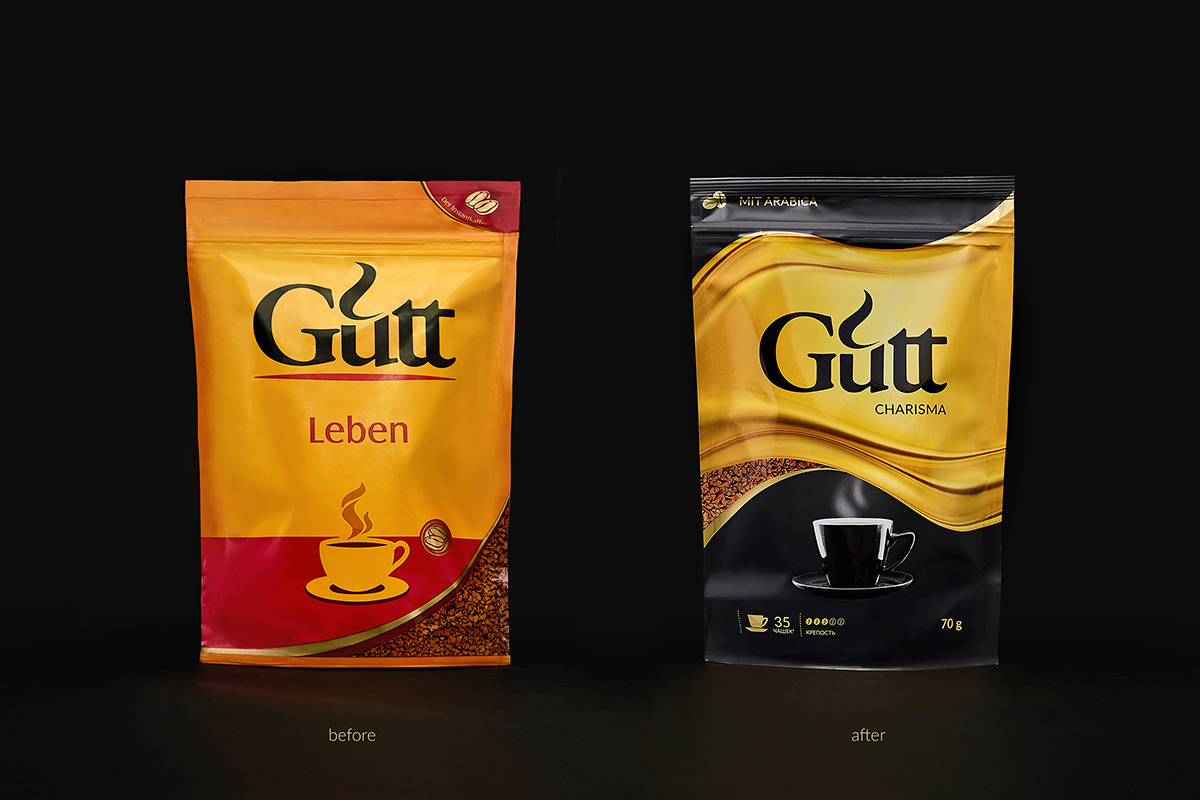 Кофе Gutt производится в Германии и поставляется на рынки СНГ и Восточной Европы. Торговая марка заявляет себя как единственный на территории Беларуси растворимый кофе немецкого качества. Состав продукта был усовершенствован — соответственно, менялась ценовая категория. Специалистам агентства нужно было обновить дизайн упаковки, чтобы рассказать об эволюции Gutt.