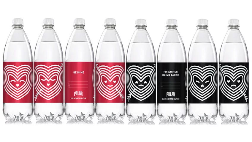 В этом году британский бренд Polar Seltzer выпустил сельтерскую воду для любителей и недругов этого праздника. Вода вышла ограниченным тиражом в двух вкусовых сочетаниях. В обоих вариантах присутствует сердце с разными выражениями лица, от улыбки до недовольства. На оборотной стороне бутылки – одно из сообщений, вроде «будь моей» или «я лучше выпью один» и пустые строчки, где можно написать имена дарителя и получателя.