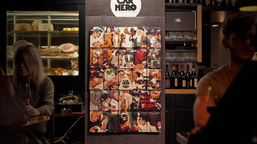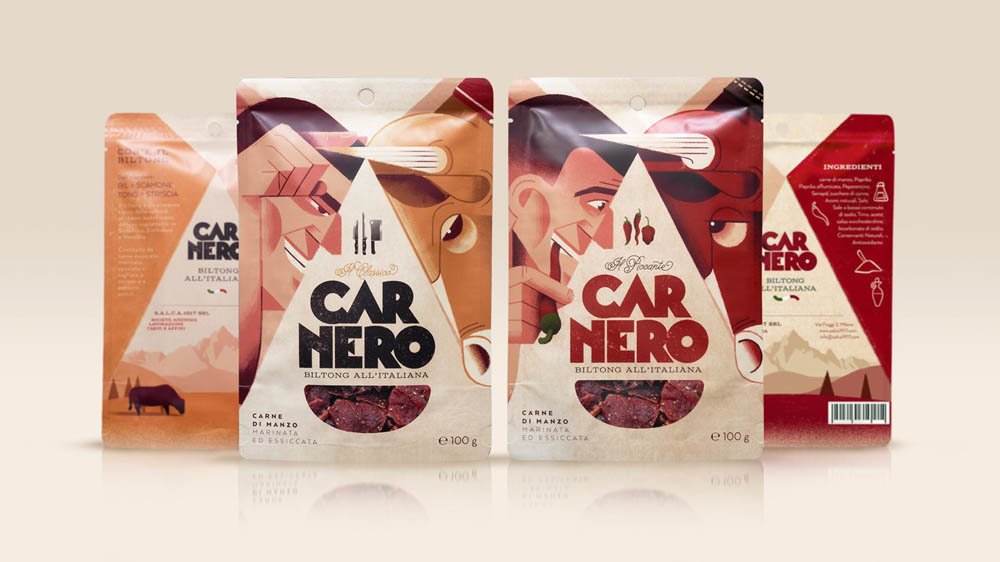 Вяленое мясо «билтонг» пришло из Южной Африки. Молодая компания решила выпускать этот продукт в Италии из местных продуктов. Она обратилась в студию The 6th с готовым названием Carnero. Carne по-итальянски означает «мясо». Это название поможет покупателю быстрее понять, что за продукт в упаковке. В 30-ых годах в Италии был известный боксер Primo Carnera. Этот факт натолкнул дизайнеров на мысль использовать эстетику тех лет в дизайне.