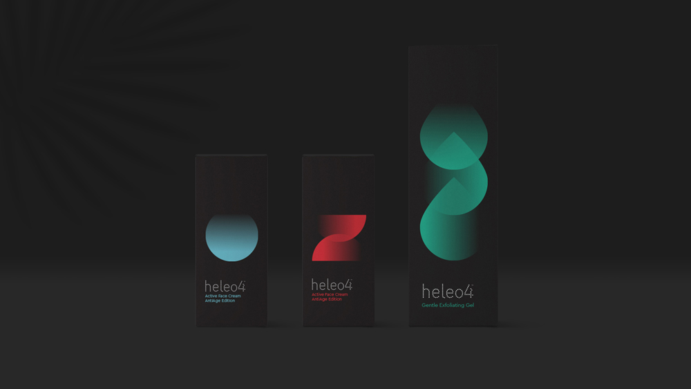 Для каждого из 6 SKU разработаны свои стилеобразующие элементы с геометрической формой в основе. Основными стилеобразующими являются: окружность голубого цвета — для линейки HELEO4™ AntiAcne, зеленая капля —для умывающих компонентов, и песочные часы красного цвета — для препаратов HELEO4™ AntiAge.