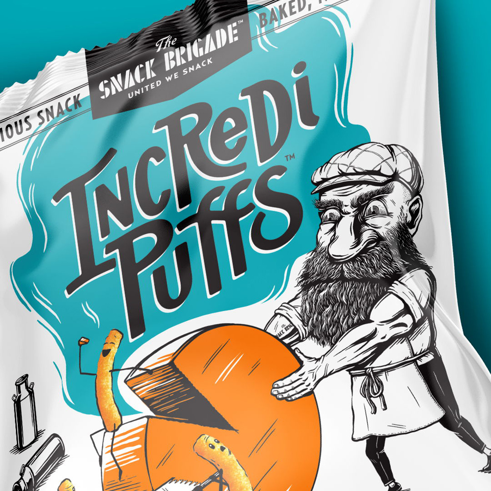 Компания The Snack Brigade – новый игрок на рынке снеков – обратилась в агентство Moxie Sozo с задачей разработать дизайн упаковки для кукурузных снеков IncrediPuffs. Это небольшие палочки, испеченные в печи. Они не содержат глютен и орехи, трансжиры и ГМО и искусственные ингредиенты.