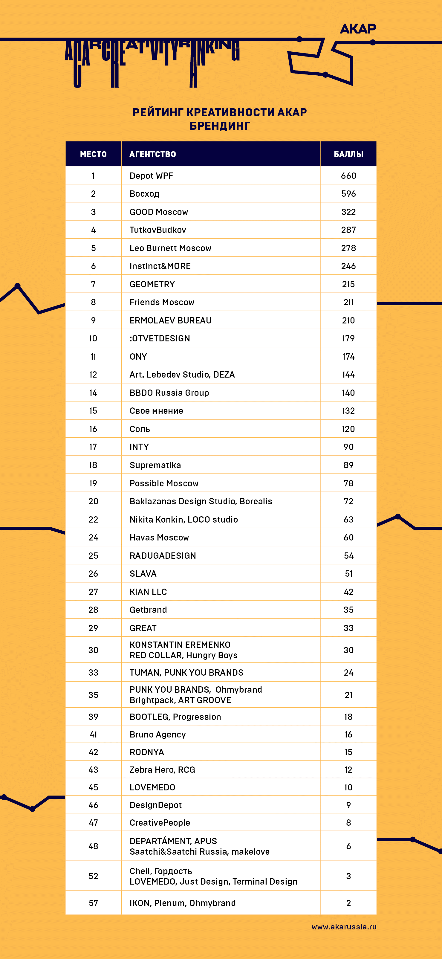 Рейтинг составляется на основе наград, полученных агентством в течение года на наиболее статусных фестивалях дизайна, маркетинга и рекламы. В 2018 году в зачет в «брендинге» шли победы в 12 фестивалях: Cannes Lions, Eurobest, ADCE, Epica, Red Apple, Ad Black Sea, ADCR, Dieline, Red Dot, Pentawards, European Design Awards и Silver Mercury. Надо отметить, что в этом году Россия, в целом, была заметна среди фестивальных номинантов - но рекордным по взятым «львам» или «пирамидкам» прошедший фестивальный сезон назвать нельзя. Поэтому борьба за лидерство была нешуточной: отрыв ближайшего конкурента, агентства «Восход», составил всего лишь 10% от общей суммы набранных баллов, а кое-где в десятке лидеров разница в позициях была практически номинальной.