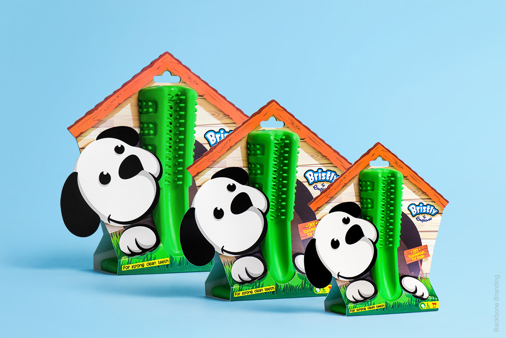 В процессе краундфандинга, в котором участвовал новый бренд, специалисты Backbone Branding разработали логотип. Он завоевал популярность, и дизайнеры решили превратить его в упаковку. Собака в будке, грызущая Bristly, наглядно демонстрирует продукт. Дизайнеры сделали упаковку плоской, сокращая тем самым затраты на ее производство.