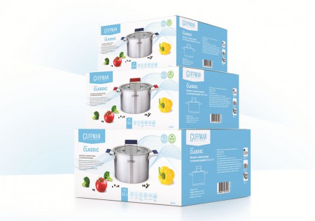 Разработанный дизайн упаковки посуды отличается большой практичностью: два фейса на основных языках с ключевыми преимуществами и характеристиками товара, боковины наполненные текстовой технической информацией и подробностями – помогают потребителю определить то, какая именно кастрюля ему нужна и подходит.