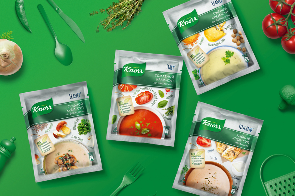 В апреле бренд Knorr вывел на российский рынок абсолютно новую и непривычную для себя продуктовую линейку крем-супов. В этом сегменте Knorr представляет четыре вкуса крем-супов: сырный, грибной, томатный и рыбный. Разработку дизайна упаковки доверили креативной команде Charsky studio.
