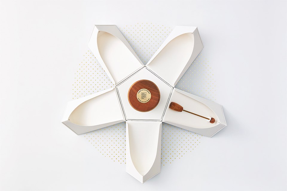 Вдохновленные цветением мануки, дизайнеры создали коробку, напоминающую цветок, который бережно хранит баночку меда внутри. Созданные мастером переплетчиком, каждый «лепесток» плотно прилегает друг к другу при помощи магнитных механизмов. Раскрываясь, «цветок» являет баночку меда и специальную палочку для меда. Банка плотно укупорена пробкой, сделанной из новозеландской красной сосны.