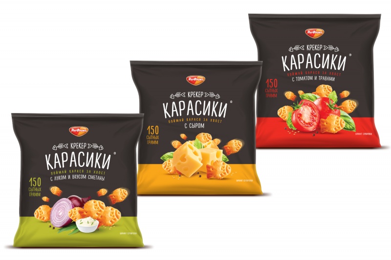 "Карасики" - это фигурное соленое печенье в виде маленьких рыбок, это вкусный и питательный снек, который используется в качестве закуски, легкого перекуса, дополняет первые и вторые блюда, а также разнообразные прохладительные напитки. Ассортимент, ранее включавший классические соленые крекеры и крекеры со вкусом сыра, дополнили «Карасики» со вкусом томата и пряных трав, а также сметаны с луком.