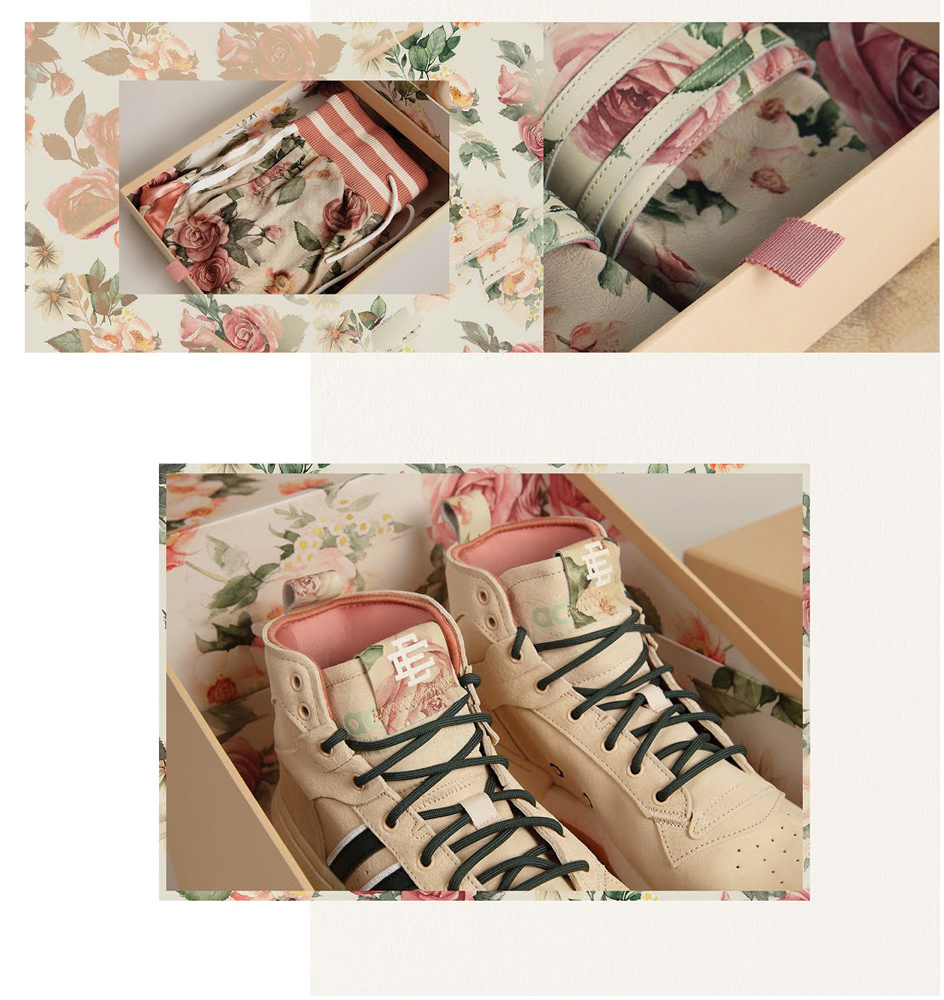 Коробка выполнена в виде шкатулки. Чтобы открыть упаковку сначала нужно потянуть за нитку, благодаря чему разорвется бумажная лента. Под ней покупатель обнаружит «записку» от дизайнера Эрика Эмануэля. Кстати, бумажная лента прошита такими же нитками, так и сами кроссовки adidas.