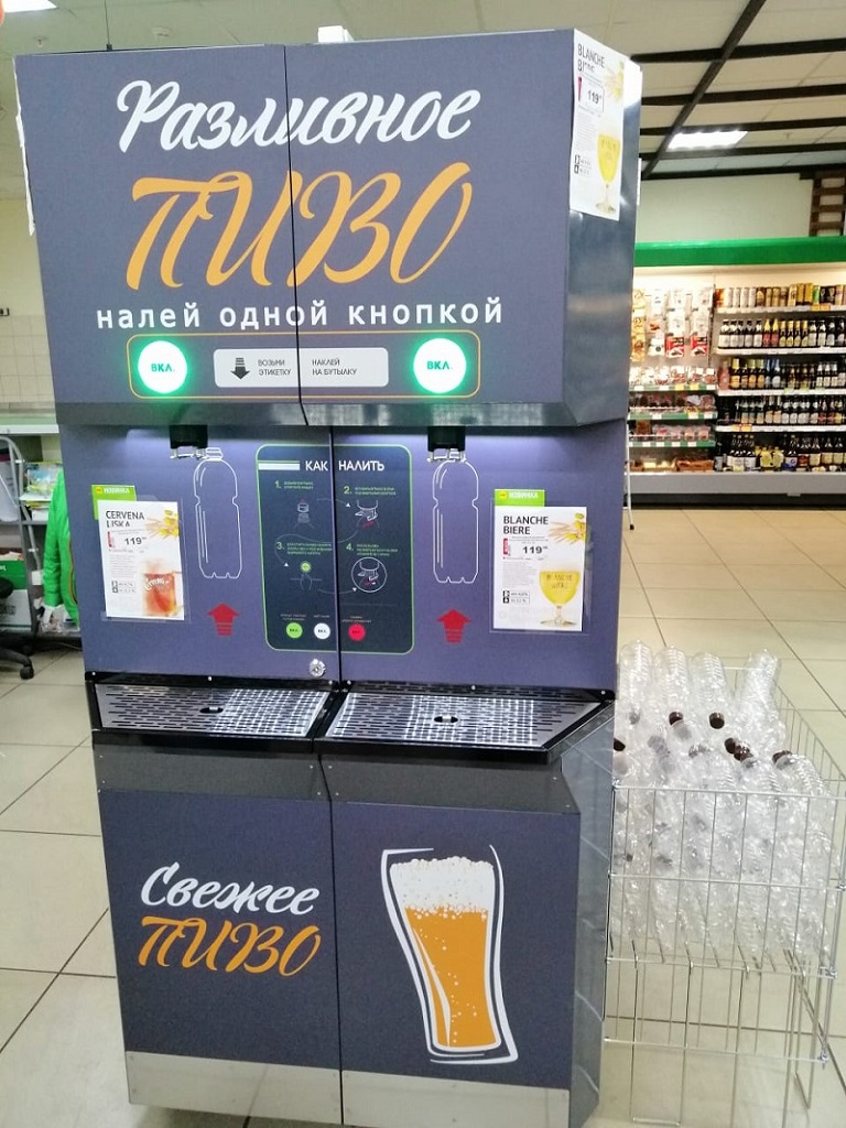 Пивоматы расположены непосредственно в торговом зале. Покупателю достаточно установить в автомат литровую пластиковую бутылку (чистая тара размещается рядом с пивоматом), нажать кнопку и наклеить тут же распечатанную этикетку со штрих-кодом для оплаты на кассе. Оплата через кассира исключает возможность приобретения алкогольной продукции несовершеннолетними, а сам аппарат запрограммирован так, что после 23.00 налив пива не производится.