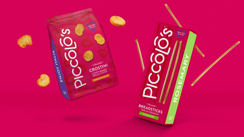 Piccolo’s – бренд в итальянском стиле, под которым выпускаются хлебные снеки. В британской студии Deuce Studio должны были создать привлекательный дизайн упаковки, который будет сообщать о дружелюбии и доступности бренда.