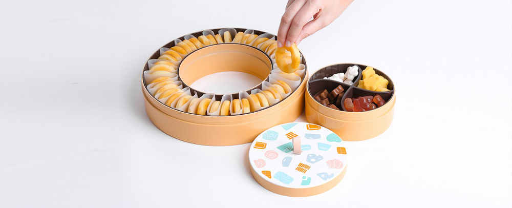 Упаковка состоит из внешней и внутренней коробки. Во внешнем отделении лежит печенье, во внутреннем разные виды мягких конфет. Покупатель может есть печенье и конфеты отдельно. А может вставлять конфеты внутрь печенья и экспериментировать со вкусами.