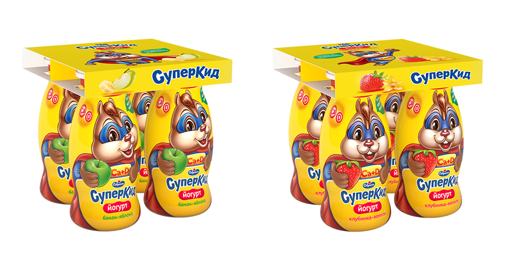 Питьевой йогурт выпускают в бутылках объемом 90 гр., форма которых адаптирована под детскую ладонь. На упаковке изображен супергерой-бурундук СуперКид – фирменный персонаж торговой марки. Новинка предназначена для детей от трех лет и представлена во всех торговых сетях Беларуси.