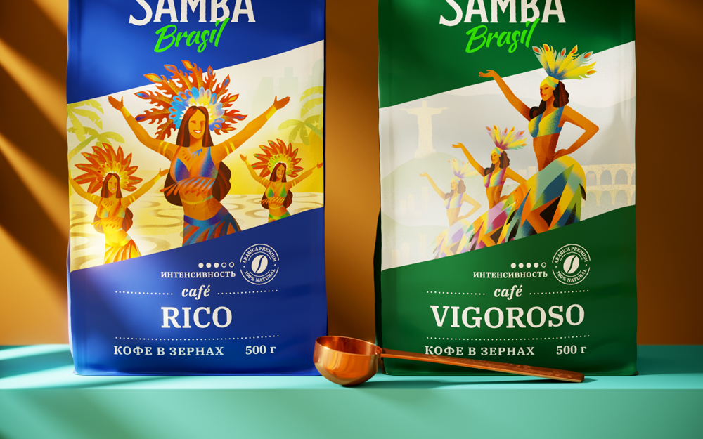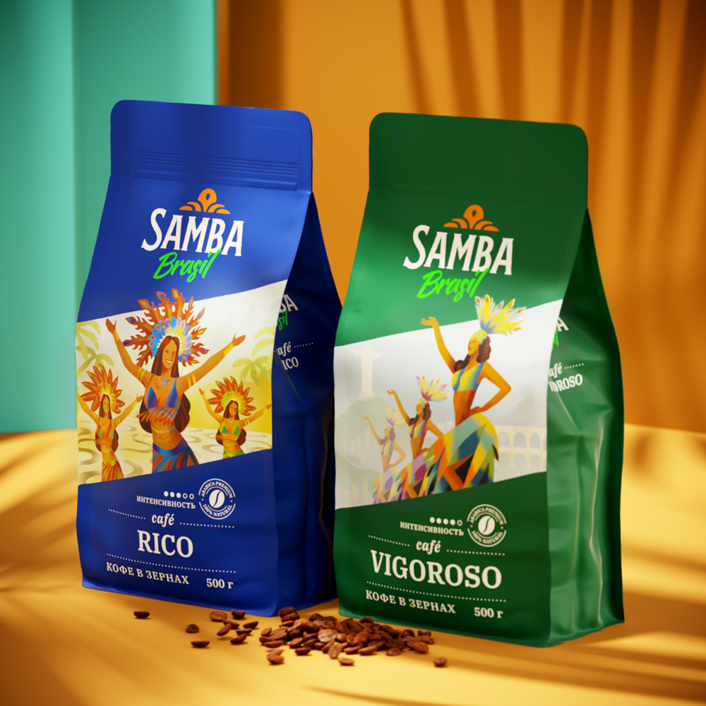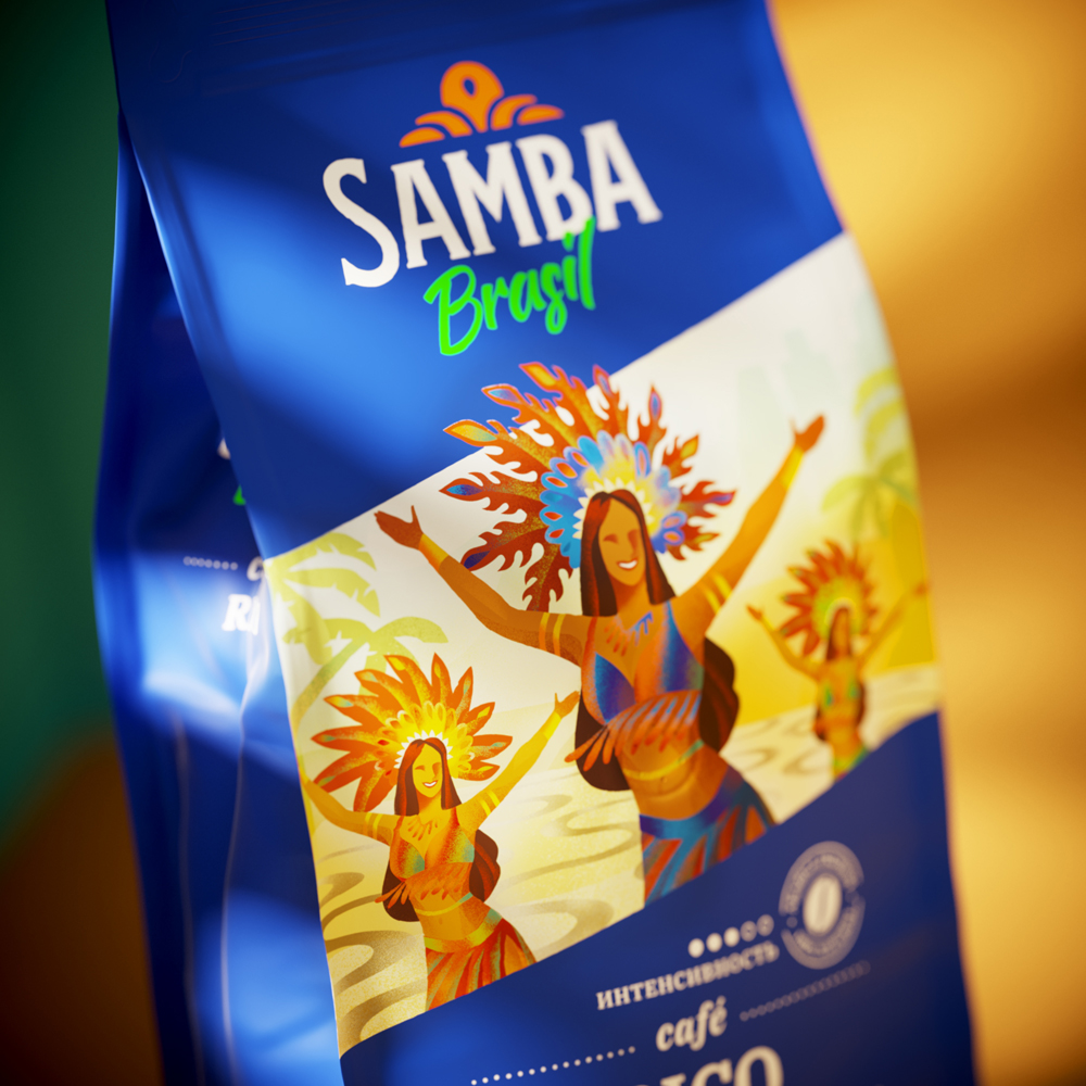Кофе – это прежде всего волшебная атмосфера, создаваемая магией аромата. А бренд — это комплекс ассоциаций и эмоций, возникающих у потребителя при контакте с продуктом. Поэтому для клиента студии Up Brands было важно, чтобы при создании дизайна упаковки четко прослеживалась идея позиционирования его продукта как бразильского кофе, который известен на весь мир. Эта идея и определила название «Самба».