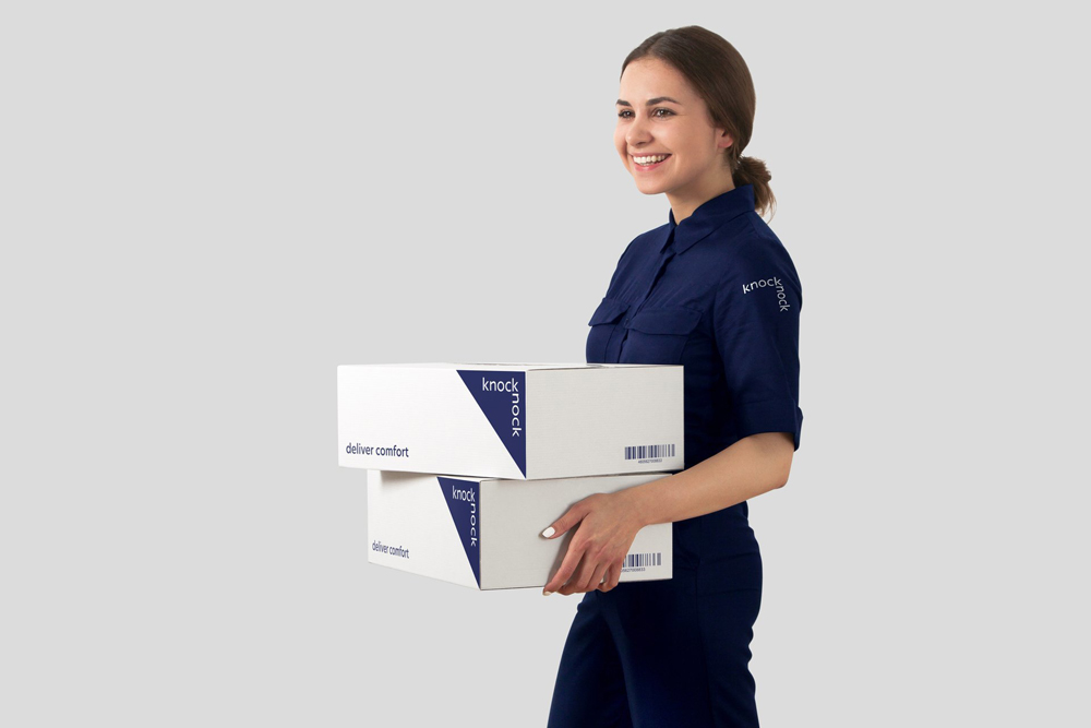 Концепция доставки развивается в фирменном стиле бренда. Многие мировые логистические службы используют стрелку в качестве символа компании. В случае Knock Knock она стала лаконичным треугольником.