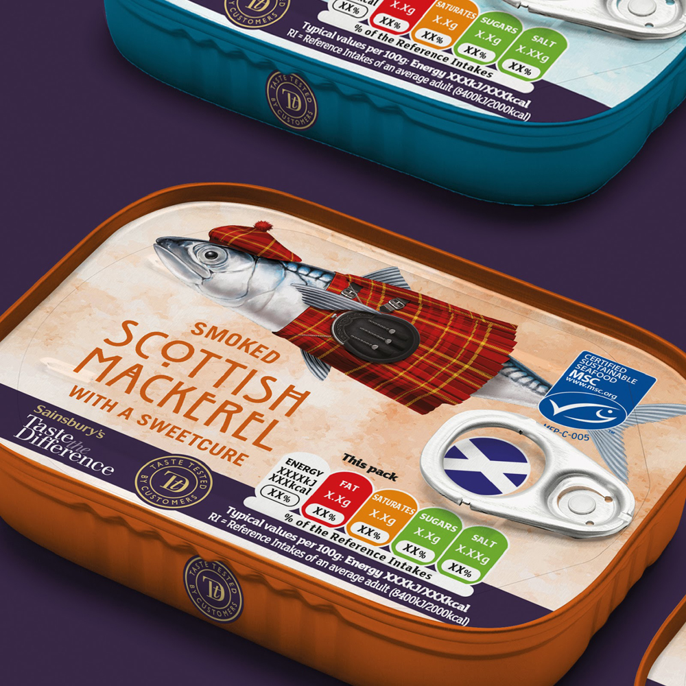 Макрели от ритейлера Sainsbury's - это маленький продукт с большой личностью. Дизайнеры британской студии BrandMe сделали акцент на происхождение рыбы, обратившись к традициям Шотландии.